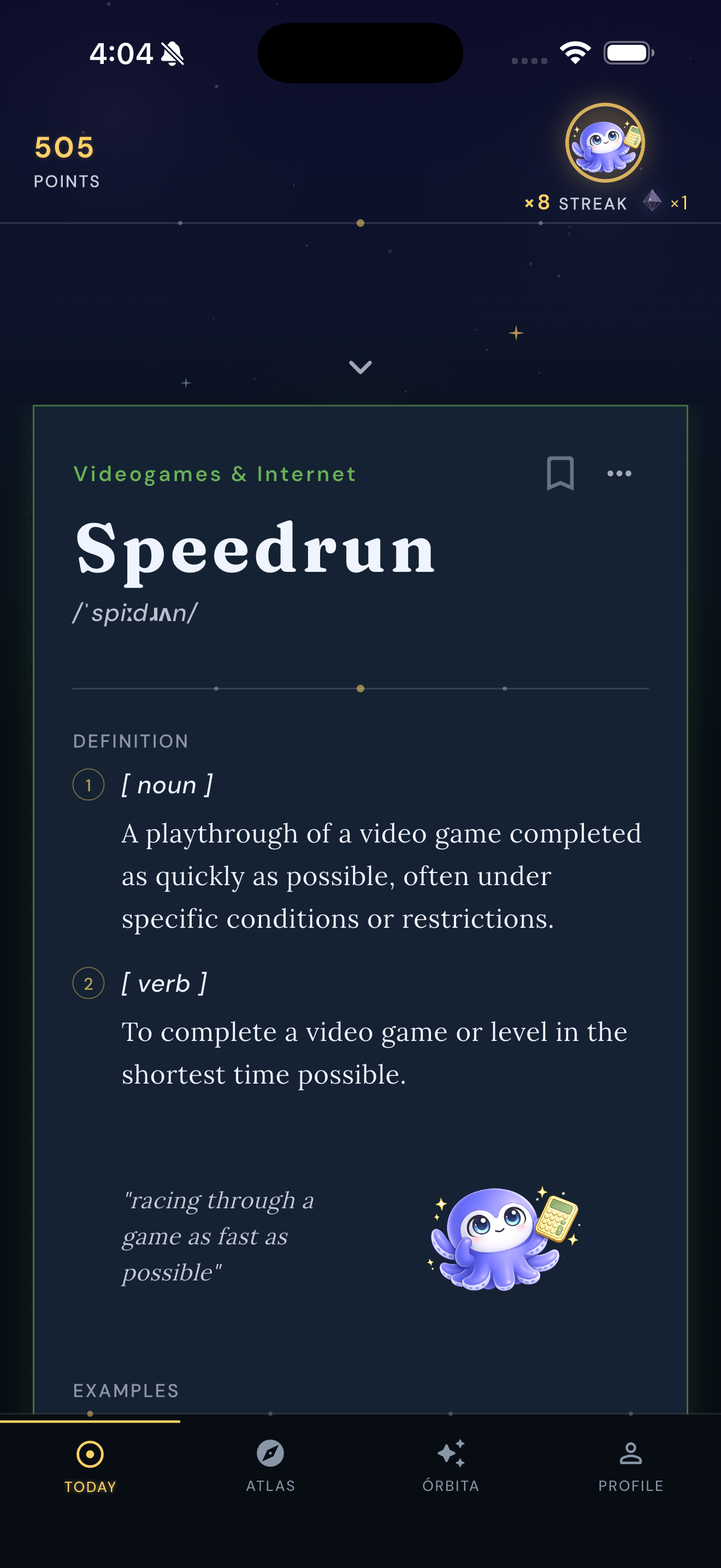 Words are curated by category and difficulty level. Each day you receive a word tailored to the categories you have unlocked, with its full definition, etymology, and usage examples.